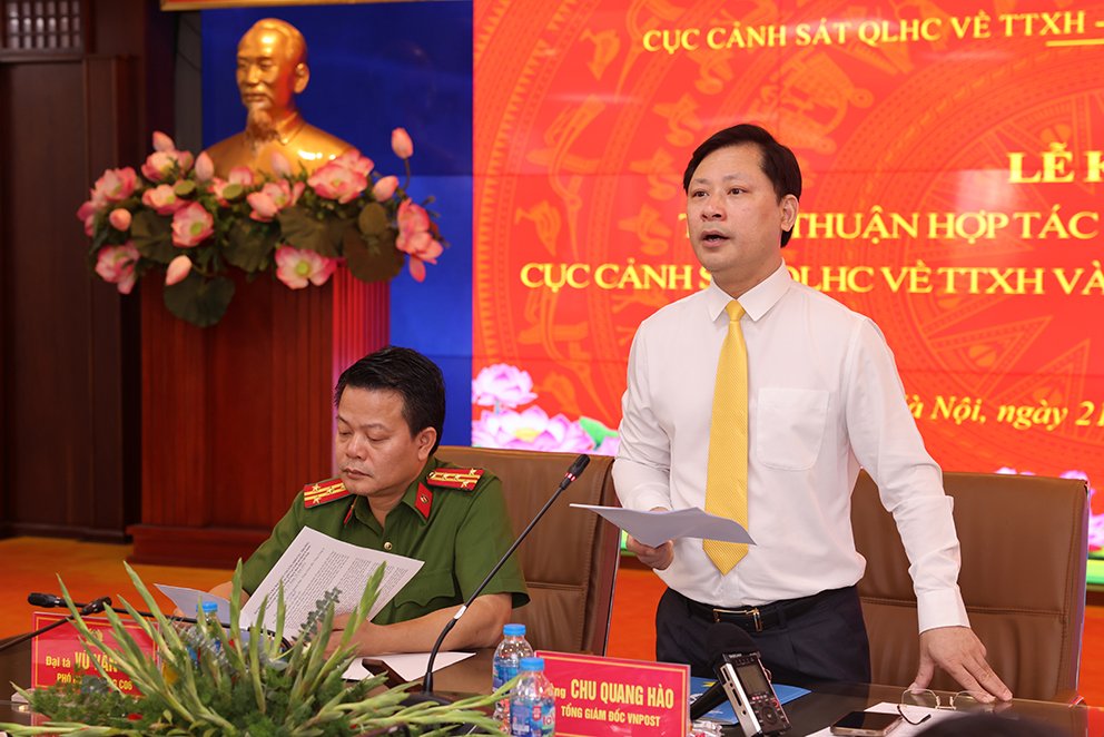 Phát biểu tại Lễ ký, Tổng giám đốc Chu Quang Hào cho biết, với những nỗ lực, kết quả đã đạt được và nội lực phát triển trong thời gian tới, hôm nay, Tổng Công ty Bưu điện Việt Nam vinh dự cùng Cục Cảnh sát quản lý hành chính về trật tự xã hội – C06, Bộ Công an ký kết Thỏa thuận Hợp tác toàn diện nhưng không giới hạn các nội dung liên quan đến cải cách thủ tục hành chính gắn với người dân, doanh nghiệp; phát triển ứng dụng dữ liệu về dân cư, định danh và xác thực điện tử phục vụ việc chuyển đổi số quốc gia giai đoạn 2022-2025, tầm nhìn đến năm 2030; đẩy mạnh tiến độ và hiệu quả Chương trình chuyển đổi số quốc gia; tăng cường áp dụng công nghệ số trong quản lý và thương mại sản phẩm nông nghiệp Việt Nam để từng bước đẩy mạnh thương hiệu nông sản Việt Nam trên thị trường trong nước và hướng đến thị trường xuất khẩu, đồng thời, thúc đẩy phát triển các dịch vụ công, an sinh xã hội.